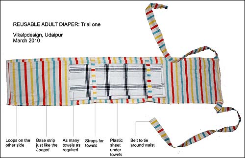 Many families are unable to buy commercial adult diapers for their patients. This design is derived from a simple traditional “lungot”. Towels and napkins can be folded and placed through the loops. A plastic strip is placed at the bottom of the towels for leaks.