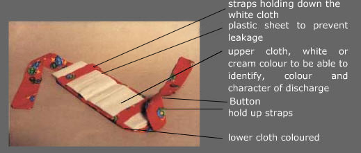 | It is common practice to use old cotton fabric, preferably of a dark colour. The belief is that it is unclean blood, so any thing will do to absorb the flow. The sanitary napkin that was developed used light coloured cloth for the upper layer!